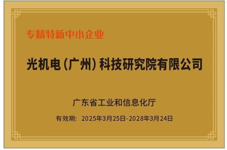 近日,经广州市工业和信息化局认定、广东省工业和信息化厅审核,光机电科技公司获得2024年广东省“专精特新中小企业”称号,在研发投入、产品创新、市场竞争力等方面均达到专精特新中小企业认定标准,是公司继获得“国家高新技术企业”称号后的又一喜讯,创新实力迈上新台阶。