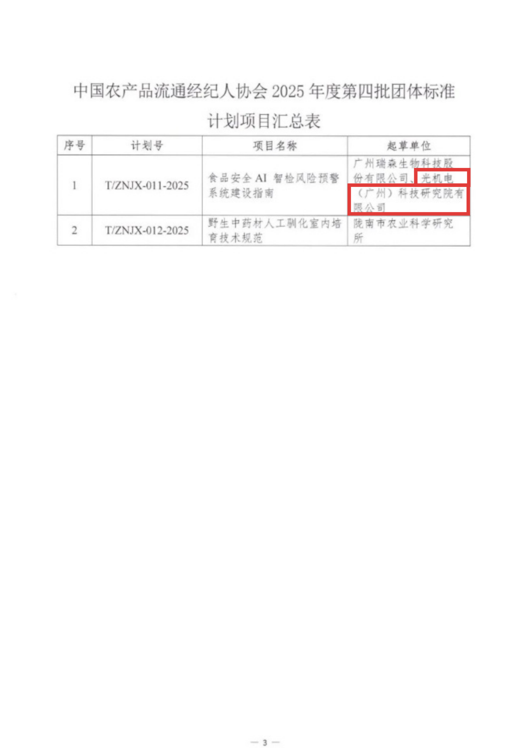 今年,光机电科技公司已获得1项发明专利授权,2项专利正在申请中,并且作为主要起草单位之一参与编制《食品安全AI智检风险预警系统建设指南》团体标准(T/ZNJX-011-2025)。